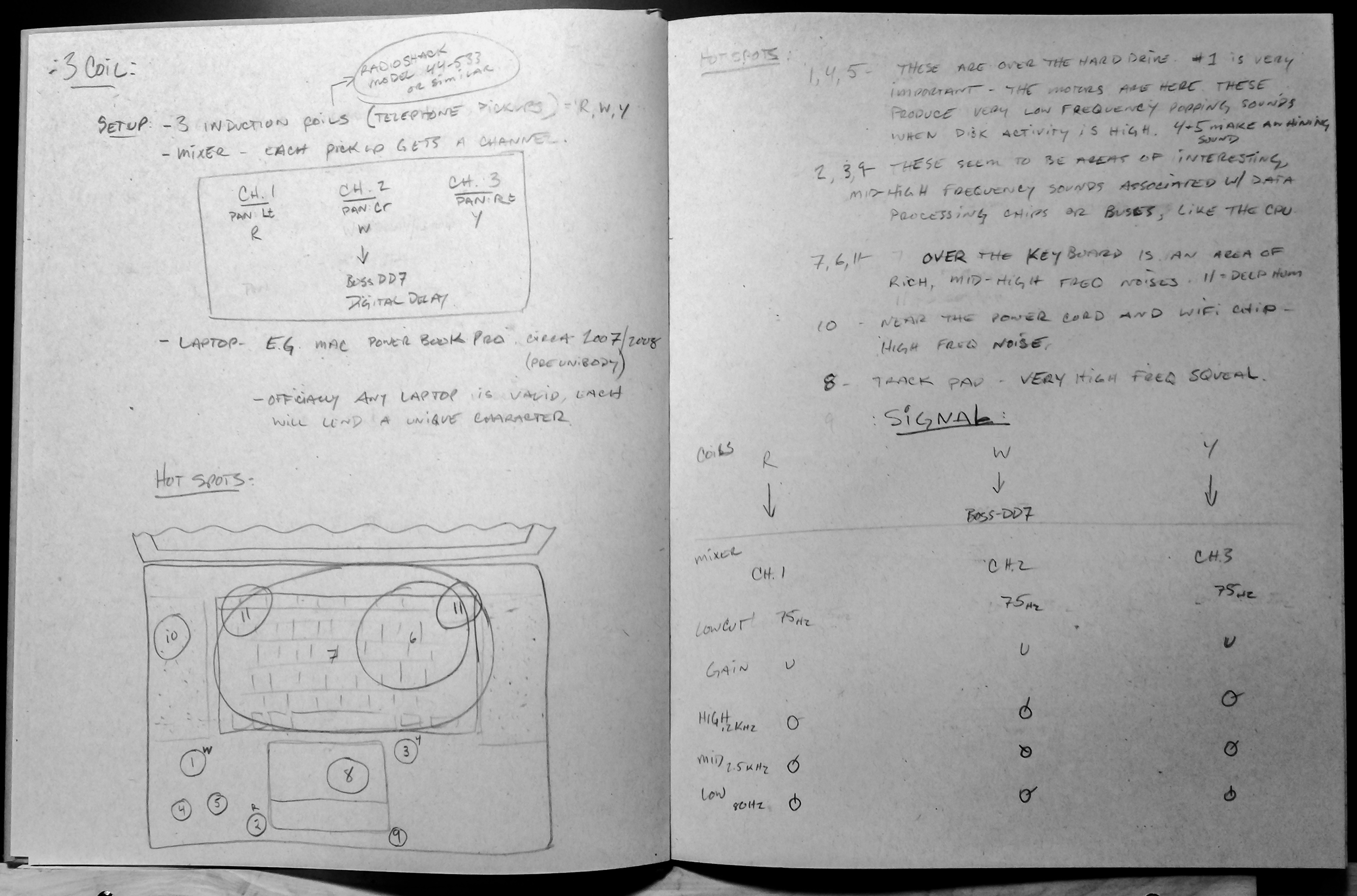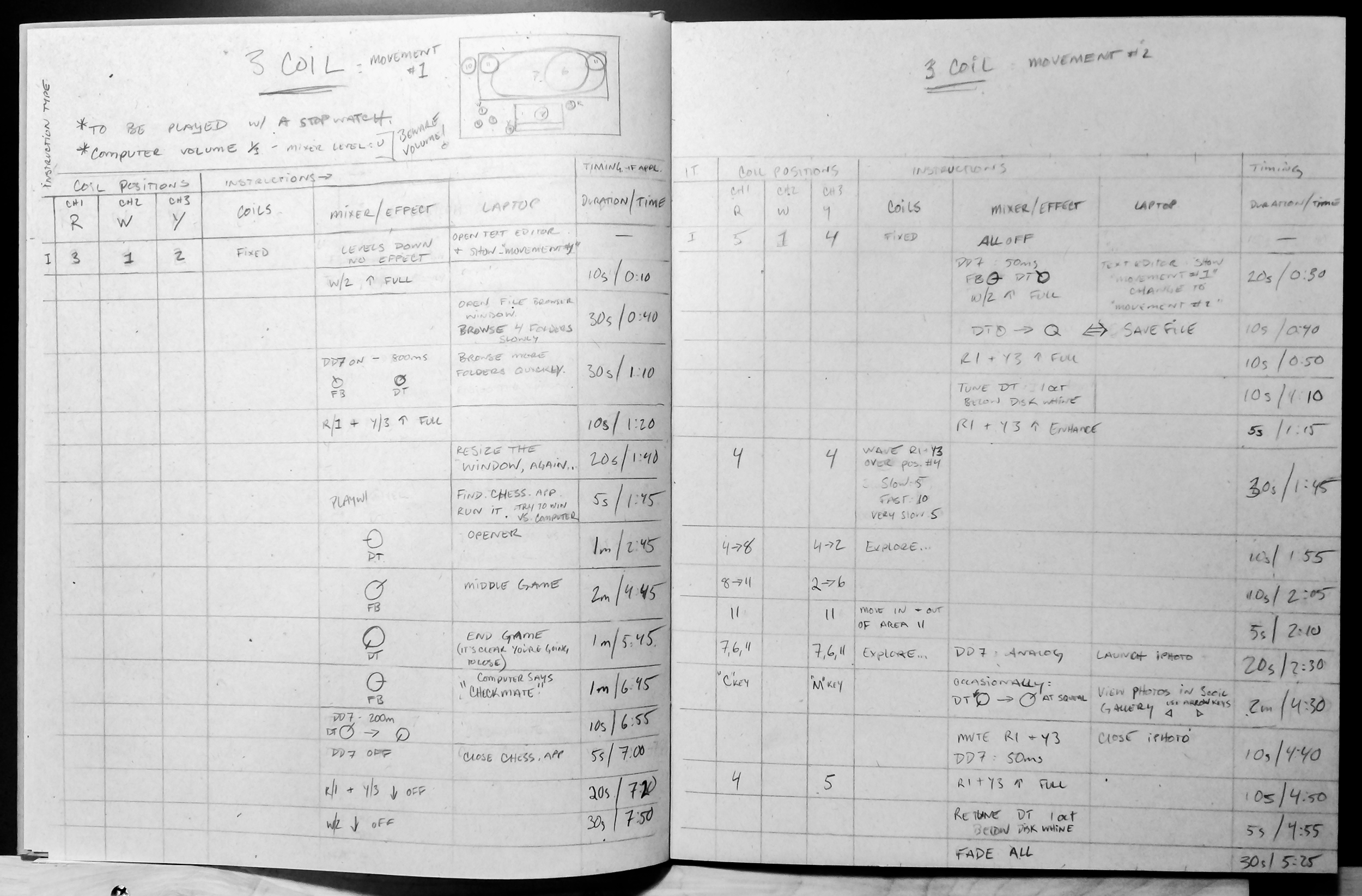 The score involves using EMF microphones to explore the electromagnetic fields created by common electronics devices. Originally it used a stopwatch to mark time. The score is created using blocks from top to bottom, spreadsheet-style. This would be modified for a looser, non-linear style and include phrases on staves for vocalists.